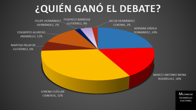 De acuerdo al muestreo que levantó la empresa, Lorena Cuéllar obtuvo el 32 por ciento de las menciones en la pregunta ¿Quién ganó el debate?, seguido de la candidata del Partido Acción Nacional (PAN), quien logró el 24 por ciento; luego el aspirante del Partido Revolucionario Institucional (PRI) con 18 por ciento y Edilberto Algredo Jaramillo del Movimiento Ciudadano con el 12 por ciento.
