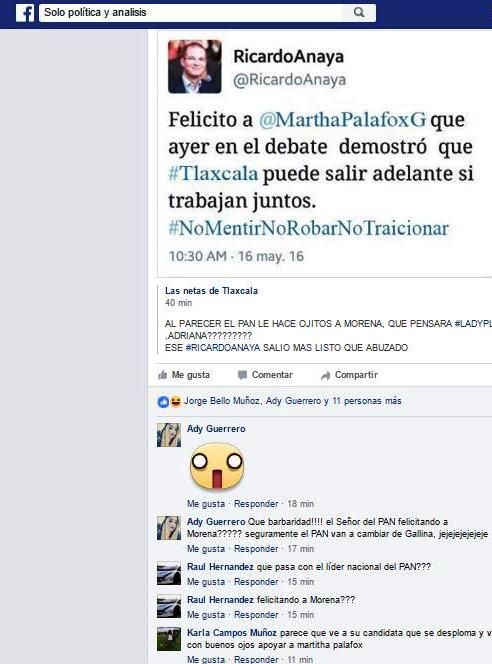 La felicitación que circula en Facebook dice: “Felicito a @MarthaPalafoxG que ayer en el debate demostró que #Tlaxcala puede salir adelante si trabajan juntos. #NoMentirNoRobarNoTraicionar” con fecha del 16 de mayo a las 10:30 AM.