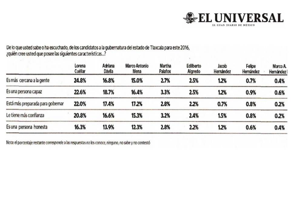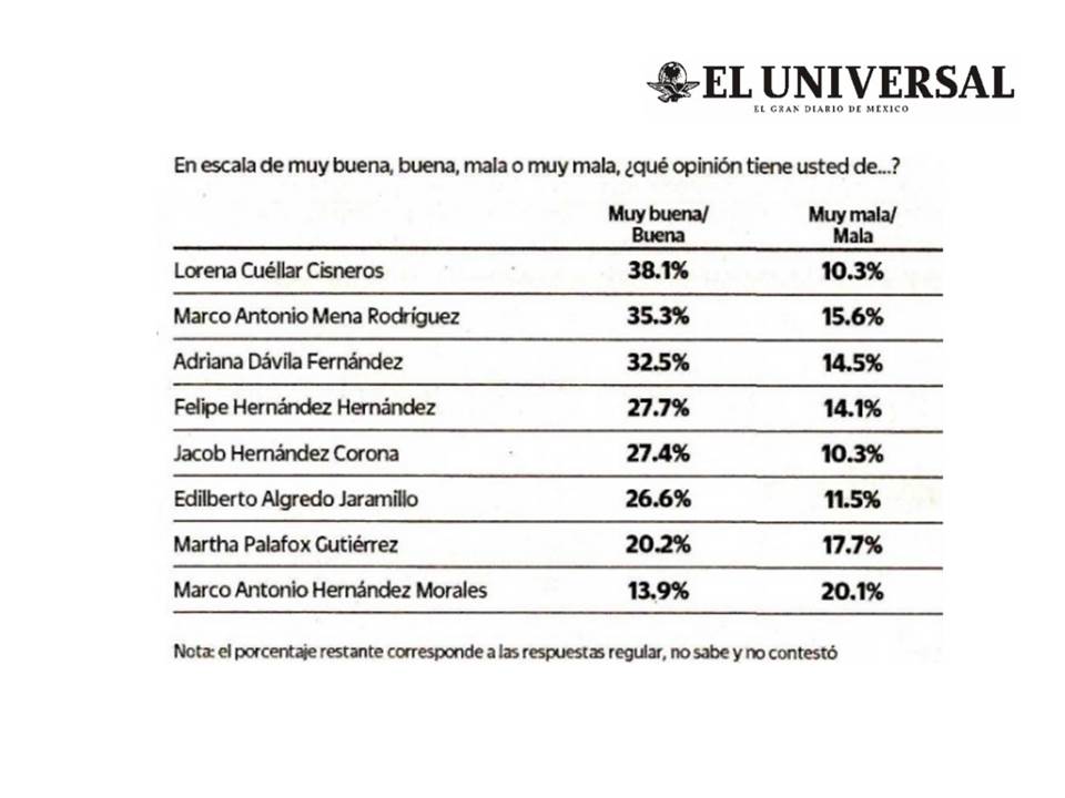 Le dijeron a los entrevistados: “en escala de muy buena, buena, mala o muy mala, ¿Qué opinión tiene usted de…?”, aquí nuevamente Lorena Cuéllar está en el primer lugar del rubro “muy buena/buena” con un porcentaje del 38.1%; el segundo lugar es para Marco Mena con 35.3% y el tercero es para Adriana Dávila con 32.5%