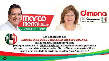 A las 18:00 horas de este día en el Salón Ángeles III de la colonia Centro se tiene previsto el cierre de campaña de la candidata del PRI a la presidencia municipal de Calpulalpan, Dimpna Macías Hernández, evento al que se espera la llegada del abanderado de ese partido al gobierno de Tlaxcala Marco Mena
