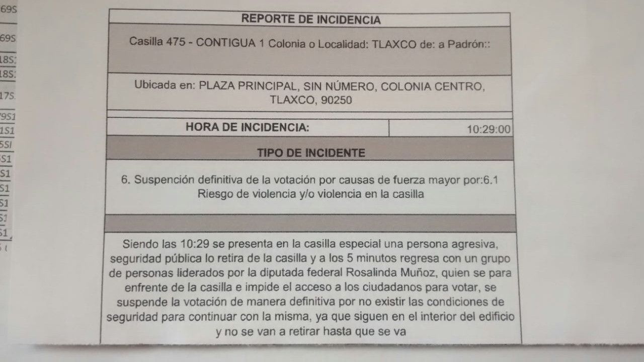 Al no existir las condiciones de seguridad para que transcurriera la jornada electoral en la casilla 475 Contigua 1, se realizó un reporte de incidencia en el que se narra que tuvo que ser cerrada ante la presencia de presuntos encapuchados que acompañaban a la diputada federal del PRI, Rosalinda Muñoz.