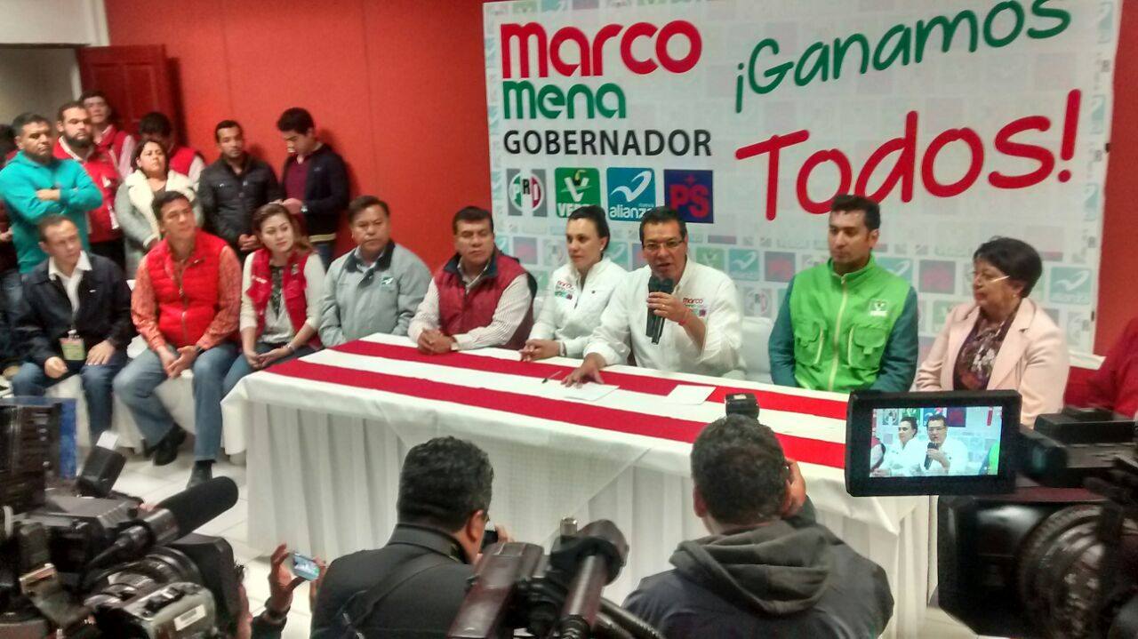 El candidato de la “mega coalición” PRI-PVEM-PANAL- PS, Marco Antonio Mena Rodríguez, se declaró el indiscutible ganador de la competencia por la gubernatura del Estado, de hecho dijo que las encuestas de salida le dan una amplia ventaja de entre 5 y hasta 6 puntos sobre sus más cercanas contrincantes.