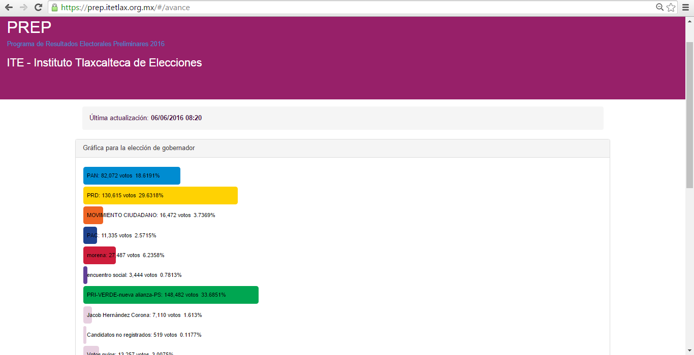De acuerdo con el PREP, el candidato del PRI al gobierno estatal adelanta en las preferencias, no obstante, los resultados no concuerdan con las actas que posee Lorena Cuéllar, lo que levanta las sospechas sobre el intento de fraude desde el palacio de gobierno y en una presunta complicidad con el Instituto Tlaxcalteca de Elecciones (ITE).