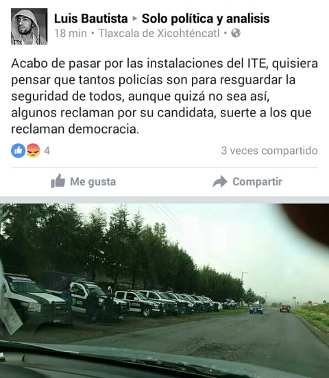 "Acabo de pasar por las instalaciones del ITE, quisiera pensar que tantos policías son para resguardar la seguridad de todos, aunque quizá no sea así, algunos reclaman por su candidata, suerte a los que reclaman democracia."