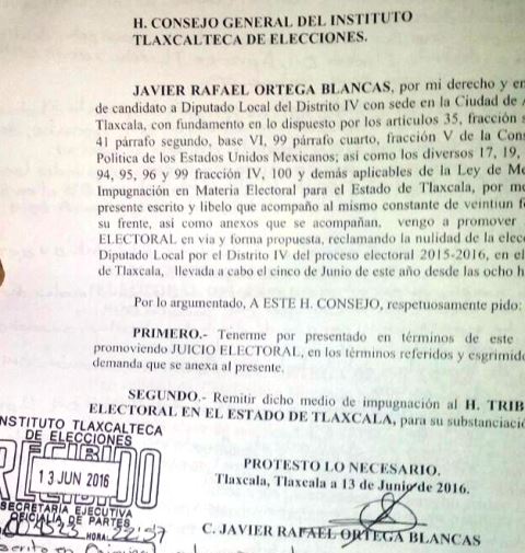 Fue la noche del pasado martes, cuando el también matador de toros presentó de manera oficial el Juicio Electoral ante el ITE para solicitar la nulidad de la elección del pasado domingo 5 de junio del 2016 en el municipio de Apizaco.