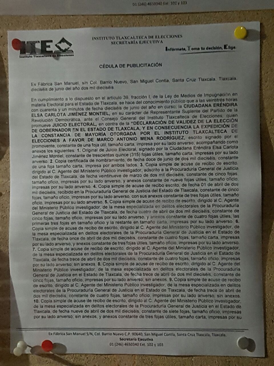 Fue a las 23 horas con 40 minutos del 16 de junio del año en curso cuando la representante suplente del PRD, Elsa Carlota Jiménez Montiel, ante el Consejo general del Instituto Tlaxcalteca de Elecciones (ITE), acompañada de la excandidata a la primera magistratura, quien promovió el juicio electoral en contra de la declaración de validez de la elección de gobernador en el estado de Tlaxcala, y en consecuencia la expedición de la expedición de la constancia de mayoría otorgada por el órgano electoral local a favor de Marco Antonio Mena Rodríguez.