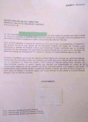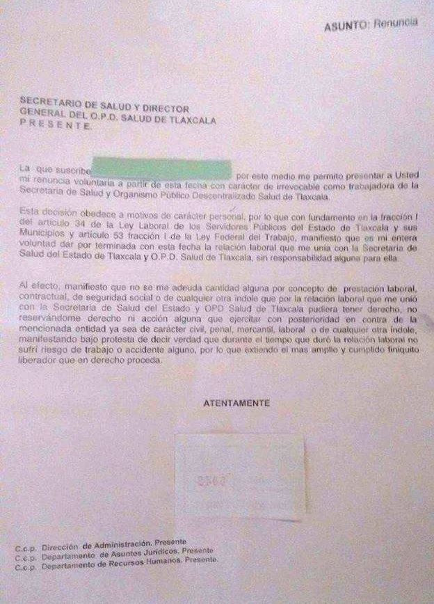 En la renuncia obligatoria se manifiesta que no existe adeudo alguno al trabajador en cuestión, además de que es manejado como un desistimiento de carácter personal, lo que de acuerdo con los trabajadores obligados tiene como intención que no haya algún impedimento legal o reclamo ante instancias en donde puedan defender sus derechos como personal que lleva laborando más de seis meses dentro de la dependencia.
