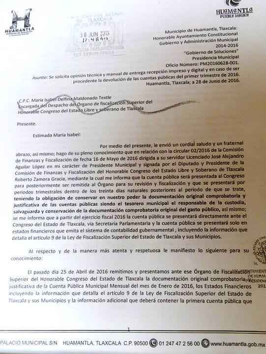Mediante oficio número PM20160628-001enviado a Delfina Maldonado Textle encargada del despacho del Órgano de Fiscalización Superior (OFS), el presidente municipal de Huamantla realizó una serie de cuestionamientos respecto a la reforma a la Ley de Fiscalización Superior del Estado de Tlaxcala y sus Municipios la cual fue aprobada el 12 de mayo por los integrantes de la LXI Legislatura.