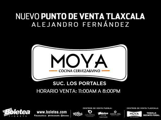 Puntos de venta autorizados en Tlaxcala: Taquilla del Recinto Ferial (lugar del concierto) y Restaurante MOYA (Plaza de la Constitución número 11, centro).