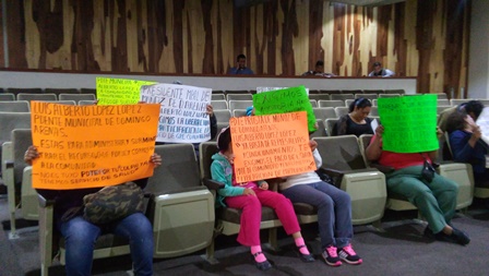 Los inconformes permanecieron en la sala de sesiones del Poder Legislativo de manera silenciosa y respetuosa, pero mostrando en todo momento cartulinas que contenían reclamos hacia el presidente municipal de Muñoz de Domingo Arenas respecto al pago del sueldo del presidente de comunidad de Guadalupe Cuauhtémoc, Valentín Sánchez, que ya asciende a 50 mil pesos.