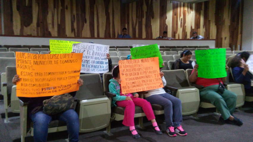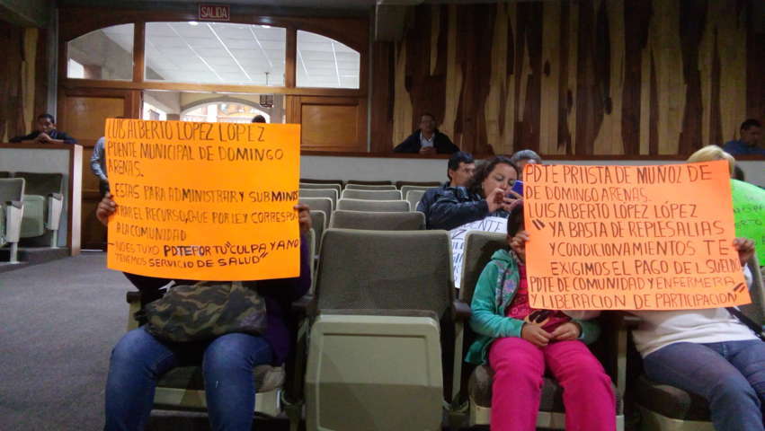 Pobladores de la comunidad de Guadalupe Cuauhtémoc, municipio de Muñoz de Domingo Arenas, se manifestaron durante la sesión ordinaria de la Comisión Permanente del Congreso del Estado que se celebró este día para exigir la intervención de los diputados y la pronta solución a sus demandas que tienen que ver con la liberación de participaciones y el pago de sueldos por parte del alcalde, Luis Alberto López.