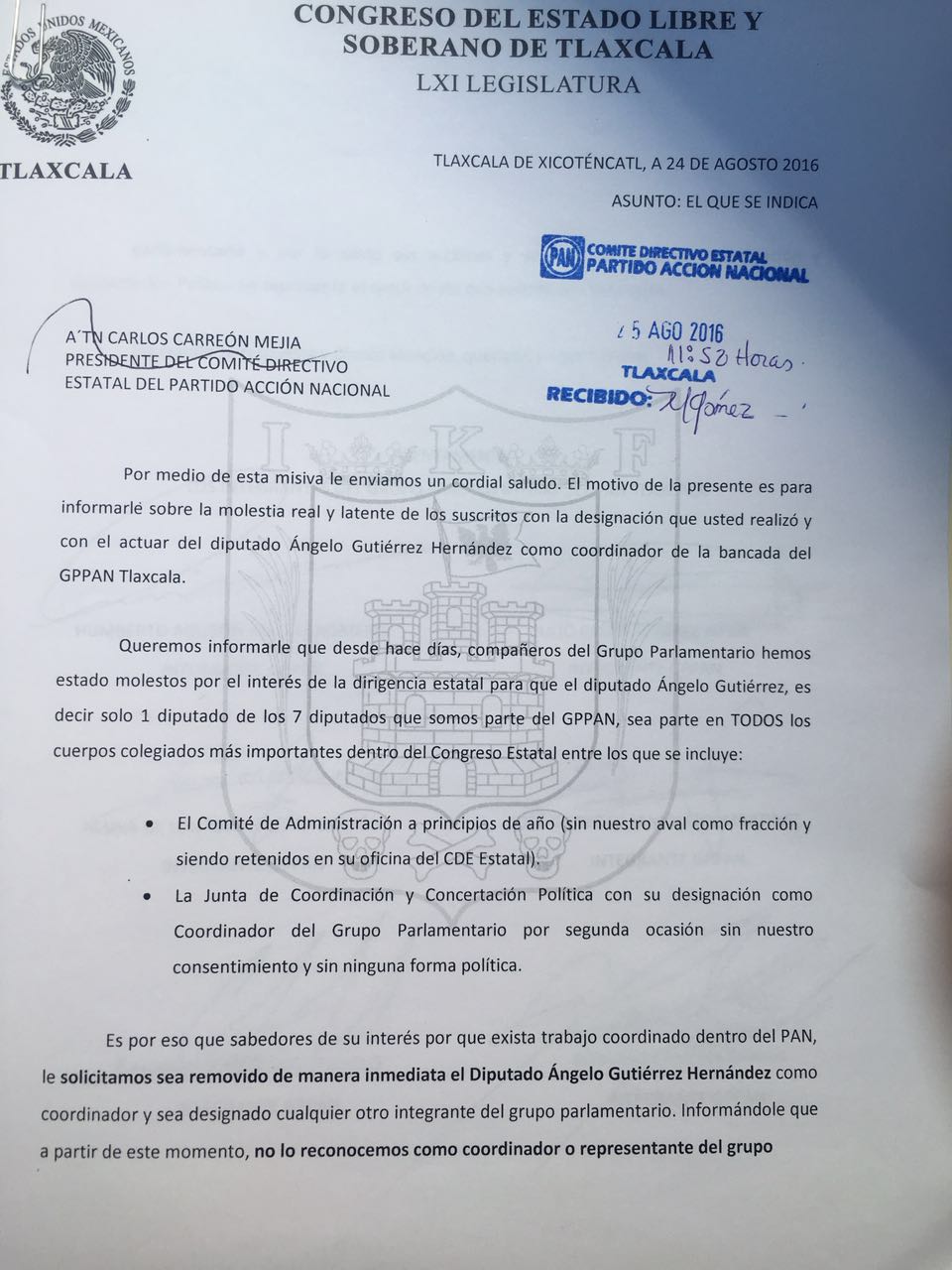 Se sabe que la tarde noche de este miércoles seis de los siete diputados del PAN notificaron de esa decisión al dirigente estatal del albiazul Carlos Carreón Mejía para que sea el quien defina al Legislador que sustituya a Gutiérrez Hernández, ya que de no hacerlo ellos lo harán por la mañana.