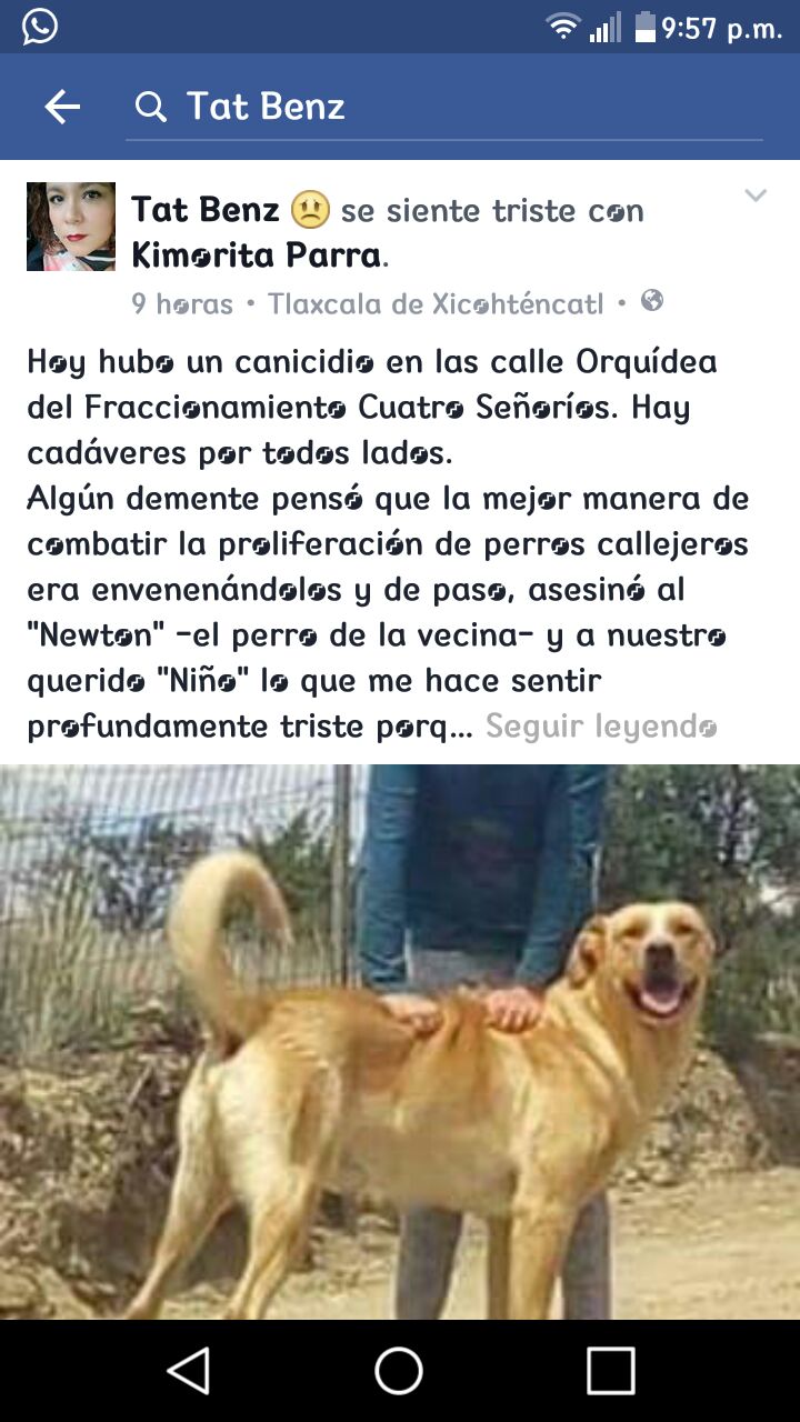 “Algún demente pensó que la mejor manera de combatir la proliferación de perros callejeros era envenenándolos, y de paso, asesinó al “Newton" -el perro de la vecina- y a nuestro querido "Niño", lo que me hace sentir profundamente triste porque siempre fue un gran compañero y el mejor perro guardián del que alguien tenga memoria”, recalcó.