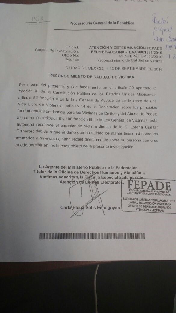 En un documento oficial entregado a Lorena Cuéllar Cisneros, fechado el pasado 13 de septiembre, la Fiscalía Especializada para la Atención de Delitos Electorales de la PGR, le reconoce la “calidad de víctima” durante el proceso electoral de este año para elegir gobernador del Estado de Tlaxcala; lo anterior como producto del análisis de los hechos asentados en la Carpeta de Investigación FED/FEPADE/UNAI-TLAX1531/2016.