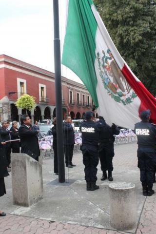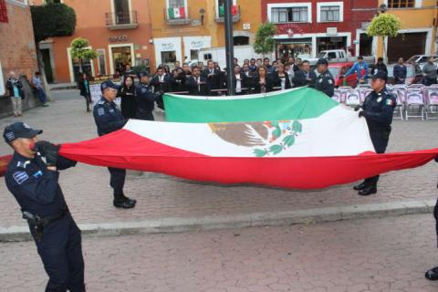 Autoridades de Tocatlan encabezados por su alcalde Jorge García Luna, realizaron el Arrío de la Bandera, en la plaza de la Constitución de Tlaxcala capital, donde rindieron tributo a los héroes que nos dieron patria y libertad, en el marco de los festejos cívicos conmemorativos al 206 aniversario del inicio de la Independencia Nacional.