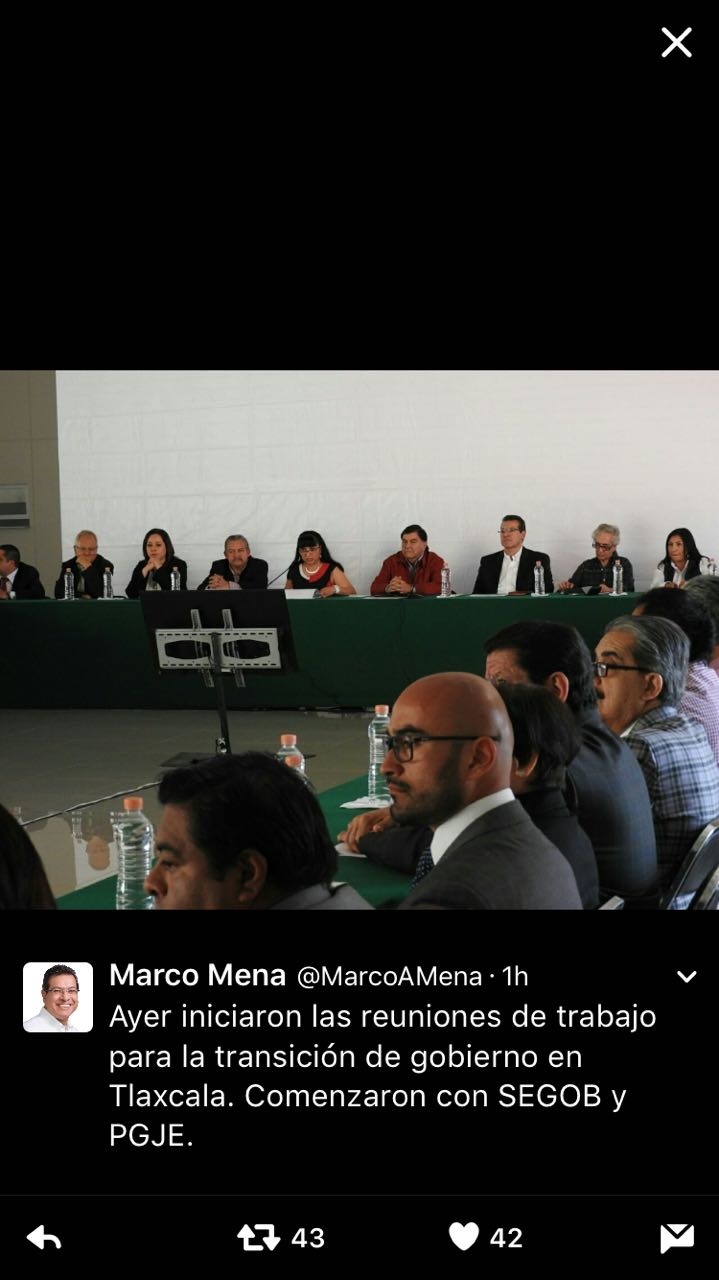 A una semana de que se confirmara su triunfo, el gobernador electo de Tlaxcala, Marco Antonio Mena Rodríguez informó a través de su cuenta de Twitter que iniciaron los trabajos de la transición de gobierno en el estado, mismos que incluyeron en esa primera etapa a la Secretaría de Gobierno y a la Procuraduría General de Justicia.
