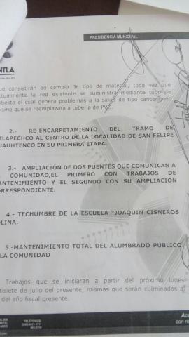 Pobladores que se reservaron sus nombres, refirieron que en el 2015, el presidente municipal signó cinco compromisos, luego de que fue presionado ante la falta de acciones en la comunidad; de los cuales cumplió “a medias” o de baja calidad, tres de ellos, quedando pendientes dos que hasta la fecha no ha entregado, como fue la rehabilitación del alumbrado público y el reencarpetamiento del camino de Atlapechco al centro de la localidad, entre otras situaciones que no ha efectuado el edil.