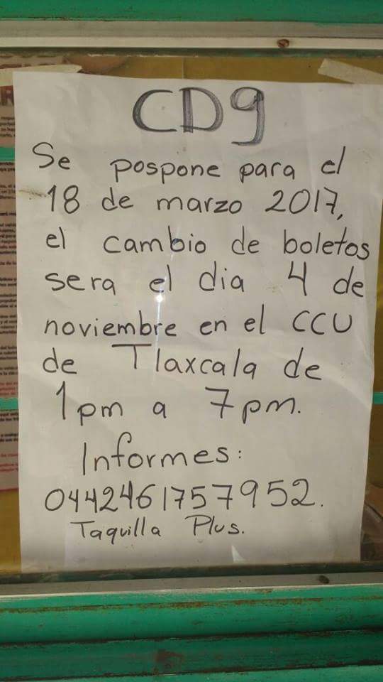 Fue en redes sociales donde fue publicada la suspension del evento musical que tendria verificativo en un estacionamiento frente al eatadio Tlahuicole el próximo sábado;"...iba a haber un concierto de CD9 el 5 de noviembre y lo habian anunciado meses atras".