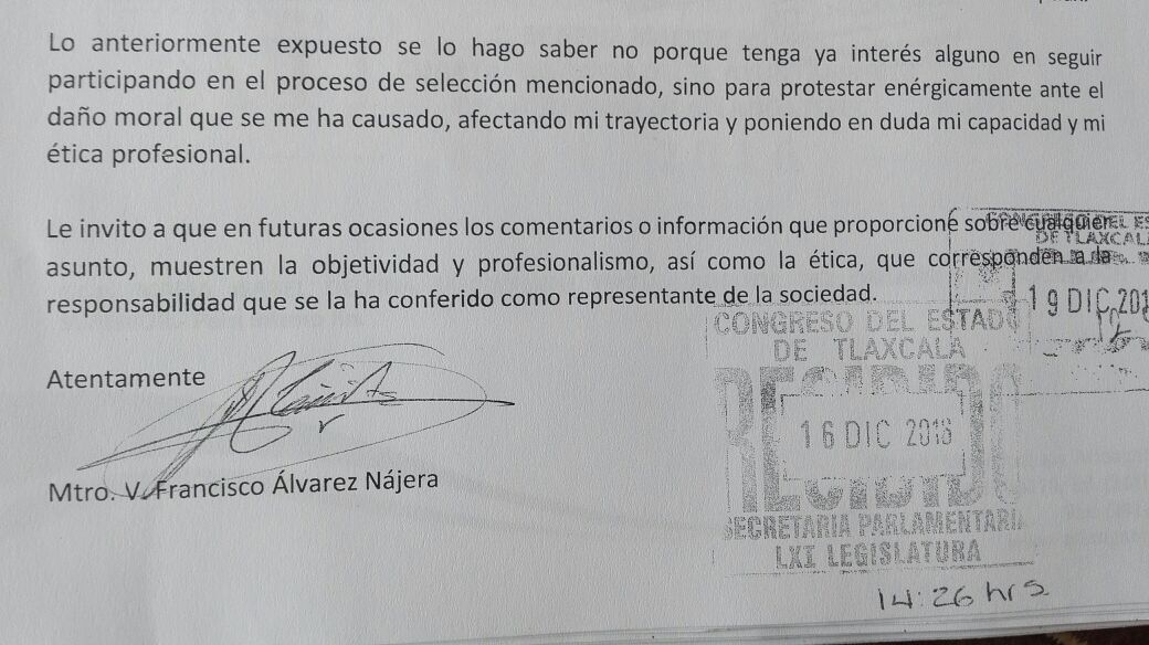 El exaspirante a integrar el Consejo General del Instituto de Acceso a la Información Pública (IAIP-Tlaxcala), Francisco Álvarez Nájera, acusó al diputado Lincoln Rodríguez Rodríguez de causarle ‘daño moral’ durante el proceso de elección que llevó a cabo el Congreso local, pues lo expuso como un profesionista tramposo al declarar que copió durante el examen escrito.