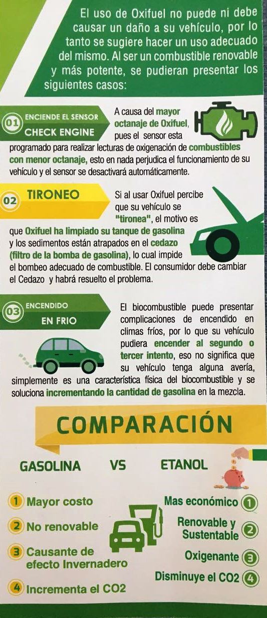 El combustible OXIFUEL está hecho a base de Etanol, lo que permite que haya hasta un 30 por ciento más de rendimiento en los vehículos, además de que tiene un octanaje de 113 contra los 92 que tiene la marca Premium de PEMEX, lo que ayuda que haya menos contaminación y desgaste en los motores.