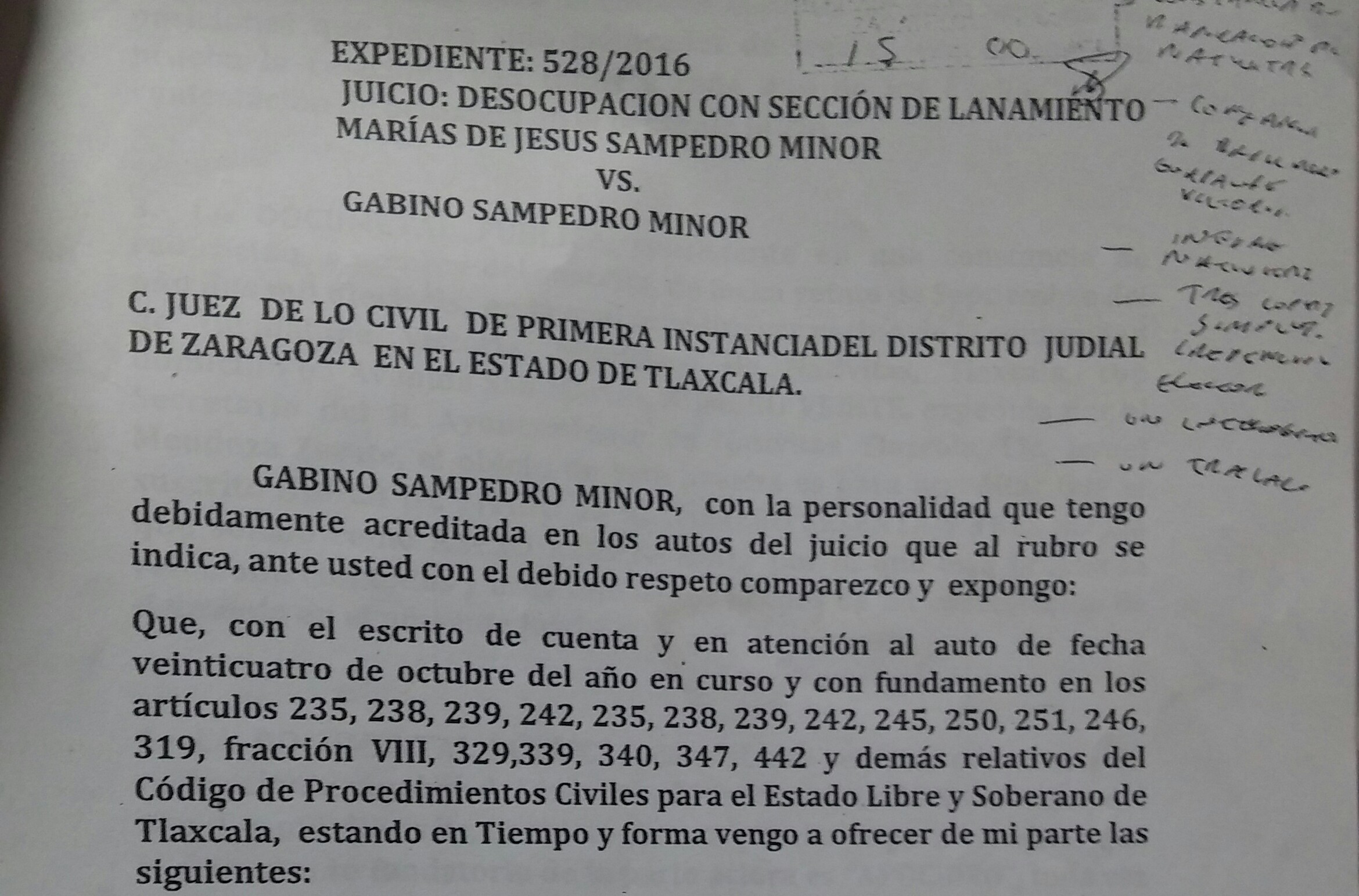 Se trata de Gabino Sampedro Minor la persona afectada quien con documentos en mano demostró que el proceso 528/2016 en su contra tiene infinidad de irregularidades que llevan la inminente finalidad de deapojarlo de su propiedad.