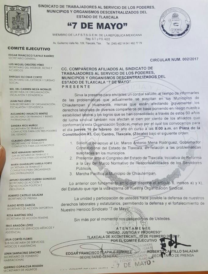 El dirigente del sindicato de burócratas al servicio del estado "7 de Mayo", Edgar Tlapale Ramírez convocó en calidad de asistencia obligatoria a las bases para que se manifestarán está mañana apartir de las 8:00 horas en el zócalo de la capital del estado para pedir al gobernador Marco Mena Rodríguez les regrese el apoyo que su dirigencia le otorgó en las elecciones pasadas y obligue a los alcaldes de Chiautempan y Huamantla a desistir en sus acciones que ponen en riesgo las cuotas sindicales.