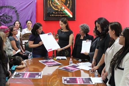 Presentando la Solicitud Pública para reivindicar la sororidad entre mujeres, misma que fue entregada y firmada de recibido por las diputadas representantes de la Comisión, así como un pliego de posiciones que exigen: