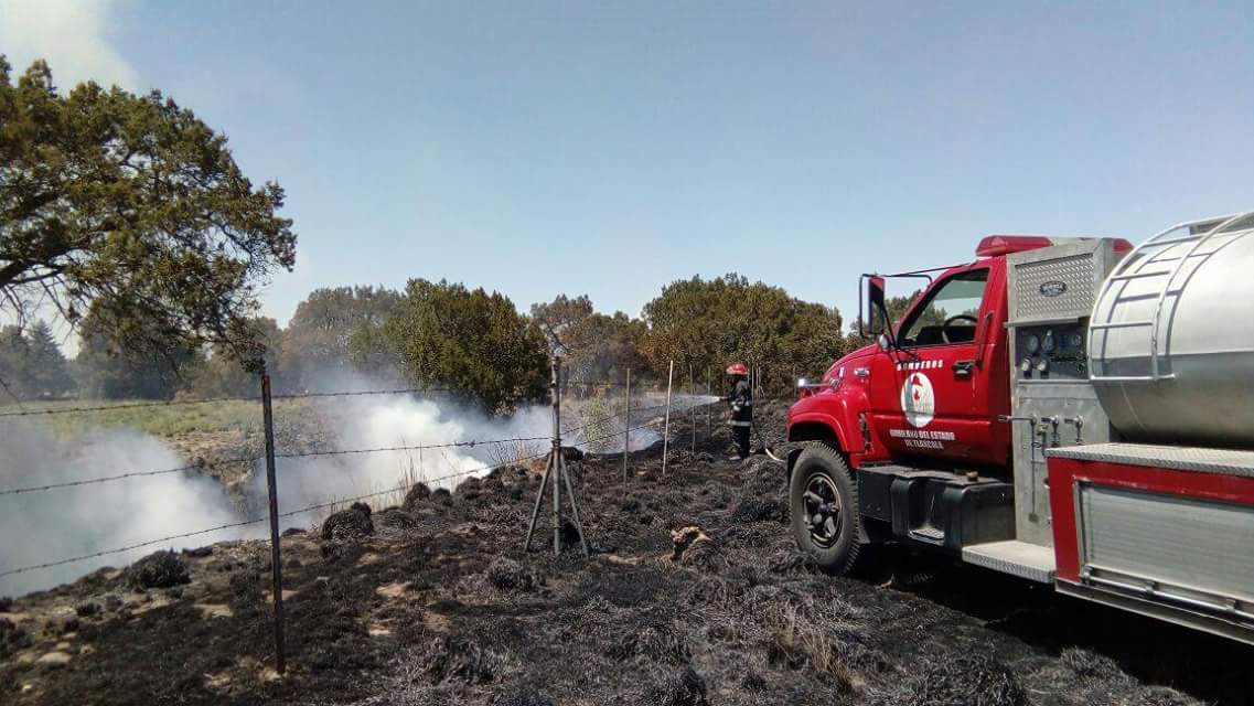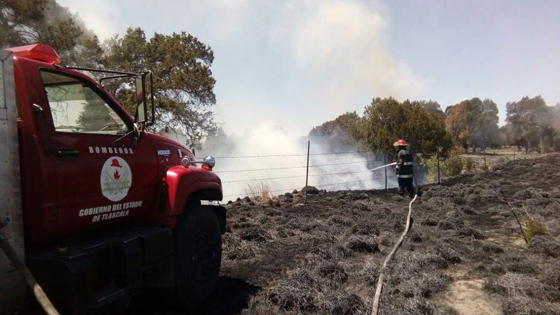 Elementos de la Comisión Estatal de Seguridad Pública del Estado apagaron el fuego en pastizales que se suscitó esta tarde en Xaloztoc