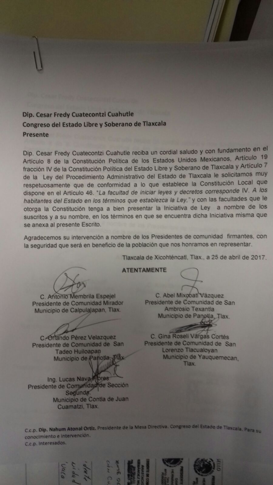 En las instalaciones del Poder Legislativo, el congresista recibió el documento firmado por el presidente de comunidad de Mirador en el municipio de Calpulalpan; el de la comunidad de Texantla y Huiloapan en Panotla; así como el del representante de la comunidad de Tlacualoyan en Yauhquemehcan y de la segunda sección del municipio de Contla.