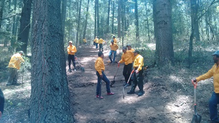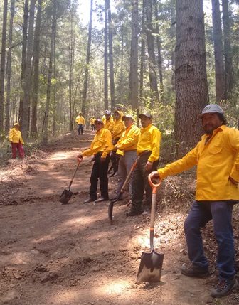 Para continuar, los asistentes fueron testigos de los avances en materia de prevención de incendios forestales, con una muestra por parte de la brigada contra incendios, con simulacro de un tratamiento especial para su combate y prevención, formando brechas cortafuego y acomodo del material combustible, recibiendo una explicación por parte de Julián Pérez Ríos, jefe del departamento de protección de la CONFOR en el estado.