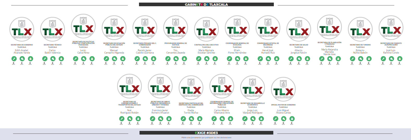 Los secretarios y funcionarios que publicaron su 3 de 3 son: Anabel Alvarado Varela, Secretaria de Gobierno; Carlos Bailón Valencia, Secretario Técnico; Lenin Calva Pérez, Secretario de Políticas Públicas y Participación Ciudadana; Manuel Camacho Higareda, Secretario de Educación; Ramón Javier Castillo Quintana, Secretario Privado del C. Gobernador; Tito Cervantes Zepeda, Procurador General de Justicia del Estado; María Maricela Escobar Sánchez, Contralora del Ejecutivo; Efraín Flores Fernández, Coordinador General de Ecología; Hervé Hurtado Ruiz, Comisionado Estatal de Seguridad y Alberto Jonguitud Falcón, Secretario de Salud.