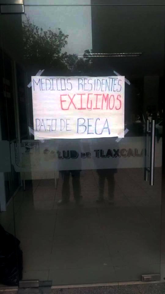 Tras dos meses sin recibir la beca federal que les otorga la Secretaría de Salud (SESA) a los médicos residentes que realizan sus prácticas en las diferentes entidades, doctores que se encuentran llevando a cabo su residencia en Tlaxcala esperan el recurso que en otros estados ya ha sido entregado, lo que los ha llevado a protestar para que la dependencia haga el pago conducente.