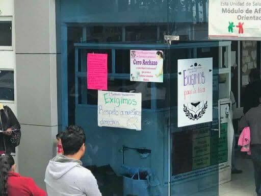 En consecuencia los médicos decidieron poner cartulinas en la entrada del Hospital General de Tlaxcala como medida de protesta para que se aplique el recurso federal que el estado no ha querido otorgar a los galenos, no sin antes hacerse acompañar de personal de la Comisión Estatal de Derechos Humanos (CEDH) ante el temor de que las autoridades pudieran utilizar la fuerza como método de represión.