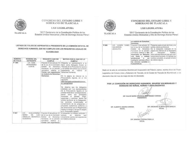 De acuerdo con la información que emitió el Poder Legislativo sobre los aspirantes que si cumplieron con los requisitos y pasar a la siguiente etapa, tres de los aspirantes fueron rechazados, entre ellos;