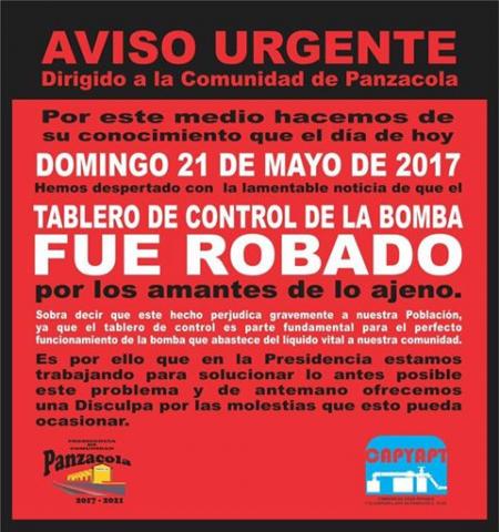 El día de ayer postearon el robo del tablero de control de la bomba de agua de la comunidad, por lo que hasta el momento los pobladores sufren de desabasto del vital líquido por una acción de la delincuencia.