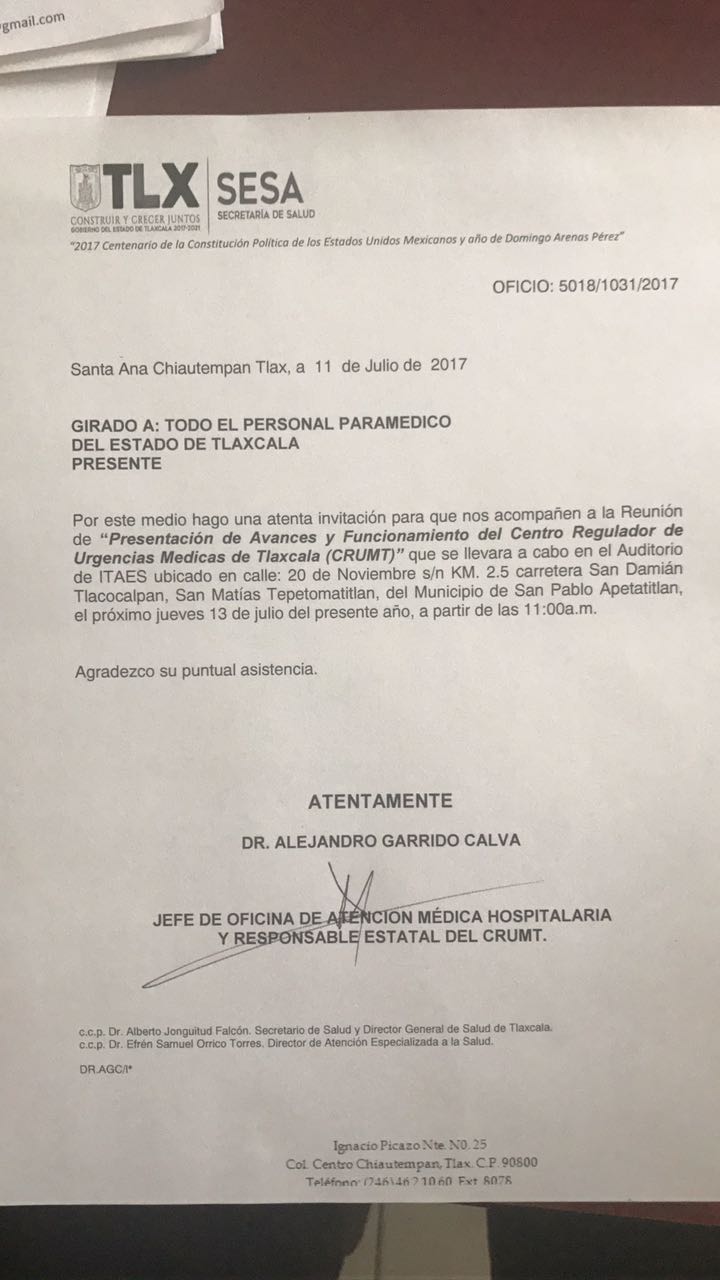 Mediante un oficio firmado por el jefe de oficina de atención médica hospitalaria, Alejandro Garrido Calva, se hizo la invitación a todo el personal paramédico para "La presentación de avances y funcionamiento del centro regulador de urgencias médicas de Tlaxcala", evento planeado para que llegue Blanca Águila a aprovechar para hacer campaña, hecho que confirmaron sus colaboradores.