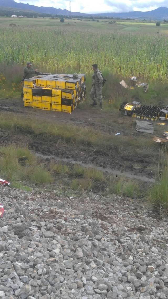 Elementos de la Policía Municipal de Atlangatepec apoyados cautro horas mas tarde por soldados de la 23 Zona Militar de la Secretaría de la Defensa Nacional (SEDENA), recuperaron alrededor de 1.3 millones de pesos producto del robo de cuatro mil 588 botellas de brandy y 164 cajas de ropa nueva que aseguraron en terrenos de labor de la comunidad de Concepción Hidalgo en el municipio de Atlangatepec.