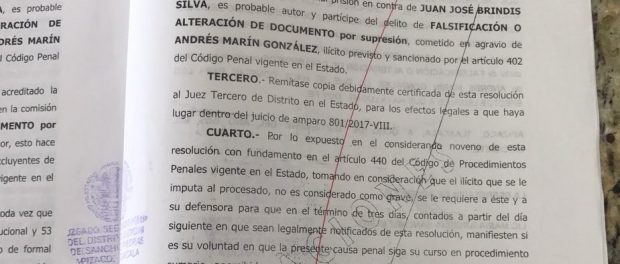 El proceso penal número 35/2017 radicado en el Juzgado Segundo de lo Penal del Distrito mencionado, Brindis Silva alteraría documentación en el que un empresario de nombre Andrés Marín González otorgó un poder notarial para actos administrativos en favor de un tercero en octubre de 2013.