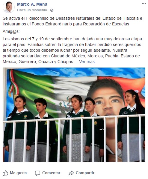 El Gobernador Marco Mena anunció en sus redes sociales que el Gobierno del Estado activó el Fideicomiso de Desastres Naturales del Estado de Tlaxcala y el Fondo Extraordinario para Reparación de Escuelas, que sumarán un total de 20 mdp, adicionales a los recursos del Fonden y de la Reforma Educativa.
