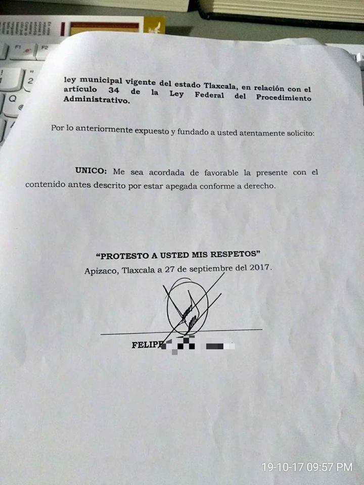 Esta petición es realizada con fundamento en el artículo 156 fracción V, de la Ley Municipal Vigente del Estado de Tlaxcala en relación con el artículo 34 de la Ley Federal del Procedimiento Administrativo.