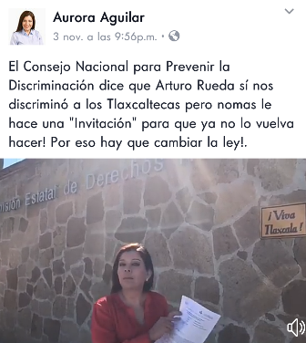 En su fan page la tamaulipeca subió un video en el que tocó la situación de discriminación hacía los tlaxcaltecas por parte de Arturo Rueda y que el Consejo Nacional para Prevenir la Discriminación concluyó que si se dio este fenómeno con los comentarios hechos por el comunicador.