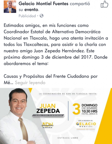 En su desesperación por hacerse de la candidatura del Partido de la Revolución Democrática (PRD) para después convertirse en el abanderado del Frente Ciudadano por México al Senado de la República, el ex alcalde Gelacio Montiel Fuentes promociona la gira del ex candidato perdedor a la gubernatura del Estado de México, Juan Zepeda.