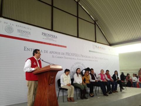 El secretario de Desarrollo Social (SEDESOL), Eviel Pérez Magaña y el gobernador de Tlaxcala, Marco Mena Rodríguez, realizaron la entrega de apoyos del programa PROSPERA y la toma de protesta a vocales de los Comités de Promoción Comunitaria del programa Prospera.