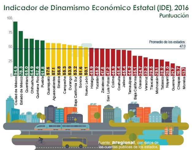 El reporte de Aregional indicó que los cinco estados con mayor dinamismo económico fueron Ciudad de México (94.9), Estado de México (78.3), Querétaro (65), Chihuahua (64.9) y Quintana Roo (62.6). Junto con Puebla fueron los estados que se ubicaron en la categoría alta.