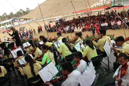 La Orquesta Sinfónica y Coros Esperanza Azteca fue la encargada de abril el telón, de esta magnífica feria, donde más de 50 niños de diferentes edades, deleitaron por casi dos horas, a las decenas de personas que se dieron cita en la unidad deportiva, donde interpretaron diferentes melodías donde el público agradeció su presencia con un caluroso aplauso por varios minutos.