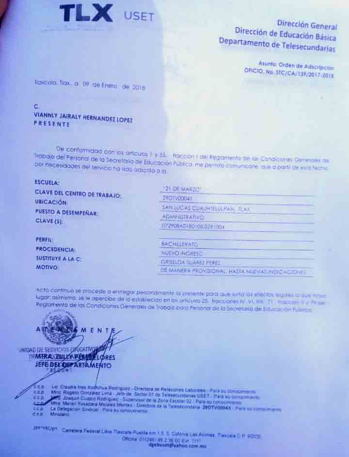 Ante la negativa de la jefa de departamento de telesecundarias, Zully Pérez Flores de pagar el salario devengado a dos trabajadoras administrativas en el plantel “21 de Marzo” ubicado en la comunidad de San Lucas Cuauhtelulpan, hicieron llegar a este medio las ordenes de adscripción firmadas por la funcionaria estatal el pasado 9 de enero.