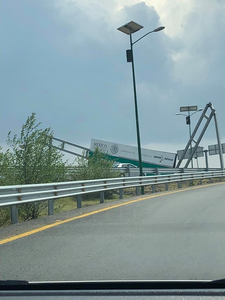 Sin una aparente causa, el letrero de la entrada al periférico de Tlaxcala colapsó y cayó sobre los carriles de esta vía que sirve como libramiento de la capital del estado.