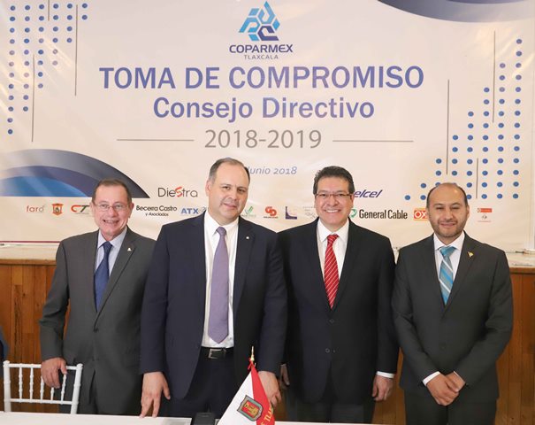 En el acto que se celebró en Apizaco, el Gobernador Mena atestiguó la toma de protesta de José Noé Altamirano Islas, como Presidente de la Coparmex en Tlaxcala.