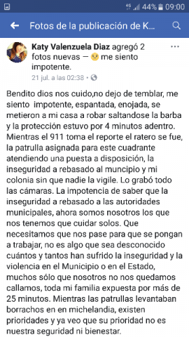 La ex servidora pública afirmó que pasó momentos de angustia cuando entraron a robar a su casa y aunque fueron parte a las autoridades tardaron en arribar al lugar cuando el delincuente había escapado.
