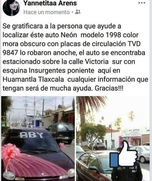 Luego de que le robaron su vehículo en la ciudad de Huamantla, un pefil de mujer en la res social Facebook, pidió ayuda para que los internautas el ayuden a encontrar la unidad que le sustrajeron en la calle Victoria Sur esquina con Insurgentes.